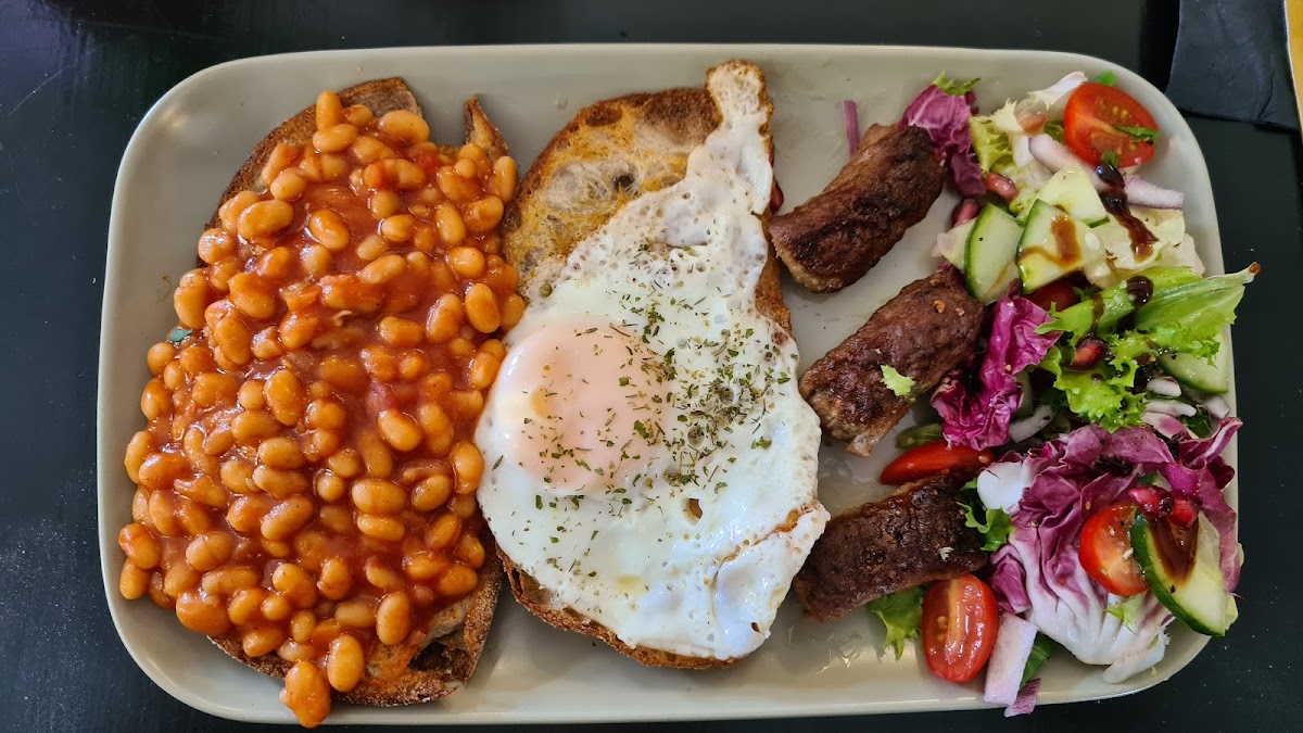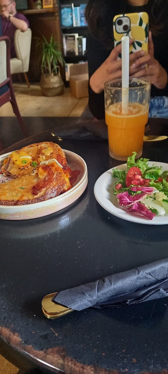 Beautiful quite cafe lovely decor, food was nice too sandwich was very delicious the kebab starter was ok and the cheese rolls were very good, the masala chai was too sweet for me the jaggary cake was delicious alongside the pasta nata alongside the almond croissant overall well priced and a nice local place will return again.